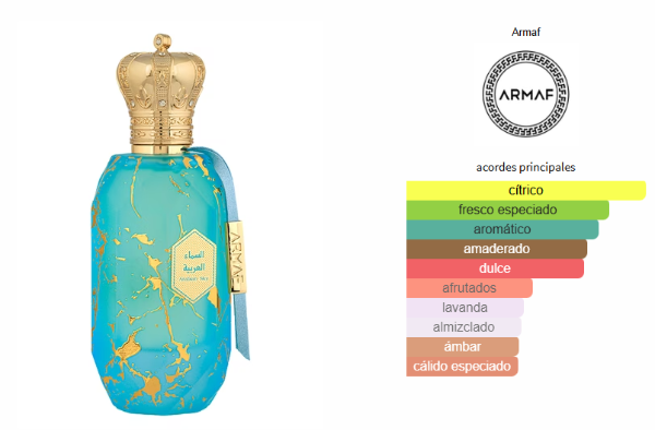 Arabian Sky de Armaf es una fragancia de la familia olfativa Amaderada Aromática para Hombres y Mujeres. Esta fragrancia es nueva. Arabian Sky se lanzó en 2024. Las Notas de Salida son piña, aceite de naranja, limón (lima ácida), toronja (pomelo), pimienta y bergamota; las Notas de Corazón son lavanda, geranio, caramelo y ylang-ylang; las Notas de Fondo son cedro, vetiver, almizcle, ámbar, pachulí y cuero.