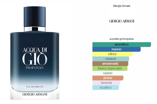 Acqua di Giò Profondo Eau de Parfum (2024) de Giorgio Armani es una fragancia de la familia olfativa Aromática Acuática para Hombres. Esta fragrancia es nueva. Acqua di Giò Profondo Eau de Parfum (2024) se lanzó en 2024. La Nariz detrás de esta fragrancia es Alberto Morillas. Las Notas de Salida son notas marinas y mandarina verde; las Notas de Corazón son romero y lavanda; las Notas de Fondo son Notas minerales, ámbar gris, almizcle, cedro y pachulí.